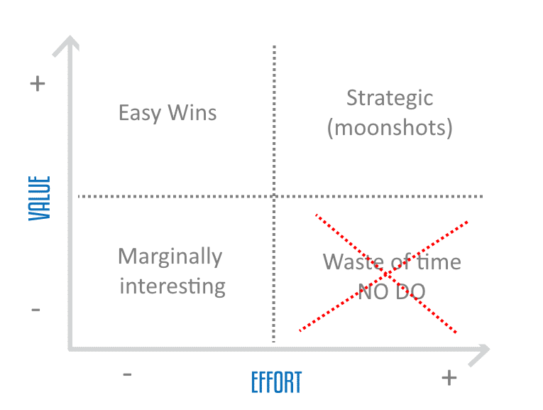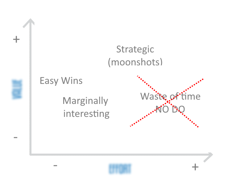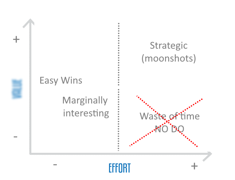 By “low-hanging fruits” people usually refer to the top-left area, aka “High Value / Low Complexity & Effort”. So far, so good. Top Right is usually referred to as “Moonshots”, big opportunities that require a dedicated and significant effort, probably not what you want to start with. And of course, nobody wants to do high-effort, low-value work, right?